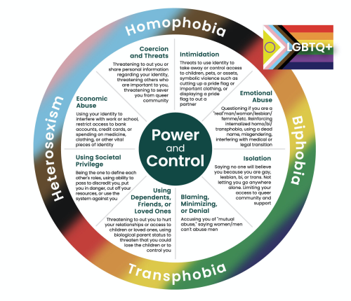 Domestic Violence, Sexual Violence, and Human Trafficking within LGBTQ2+ communities are fundamentally driven by power and control. These issues are often made worse by societal stigma, homophobia, and transphobia. Abuse can take many forms, including threats to "out" someone, manipulation of hormone therapies, and higher rates of sexual assault. Individuals may also encounter unique barriers when seeking help.